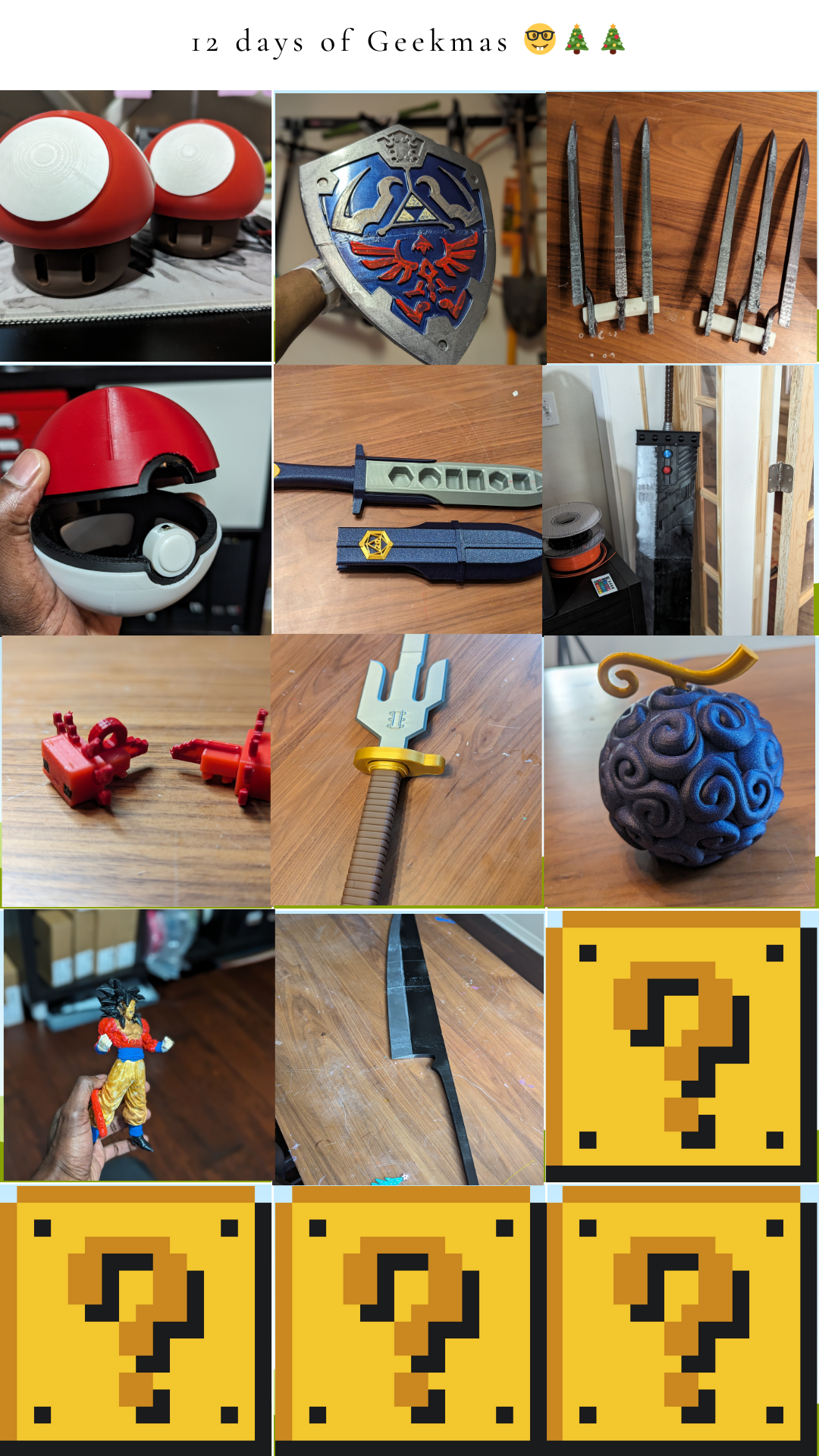 Christmas is only 12 days away and we didn't want to leave you hanging without some awesome 3d prints to drool over. We've decided to do something fun. Over the next 12 days the Geeky Inc team is going to print, and share, 12 different Geeky 3d Prints. This special series is a celebration for our community of tech enthusiasts, gamers, and geeks at heart. We'll be introducing a new and unique geeky print, from an anime, video game or just something fun and geeky. I'll be sharing videos of each print being crafted on my 3D printer, giving you an insider’s look at the magic behind the process. Plus, for those who love to get hands-on, I'll provide links to the STL files for each creation. And here's something to boost the excitement: based on our subscriber counts and engagement on social channels, we may select three of our lucky subscribers or members and provide them with a chance to win one of these incredible geeky prints! Check back here for the latest print and let's celebrate this "Geekmas" with style! 🎄🖨️🕹️