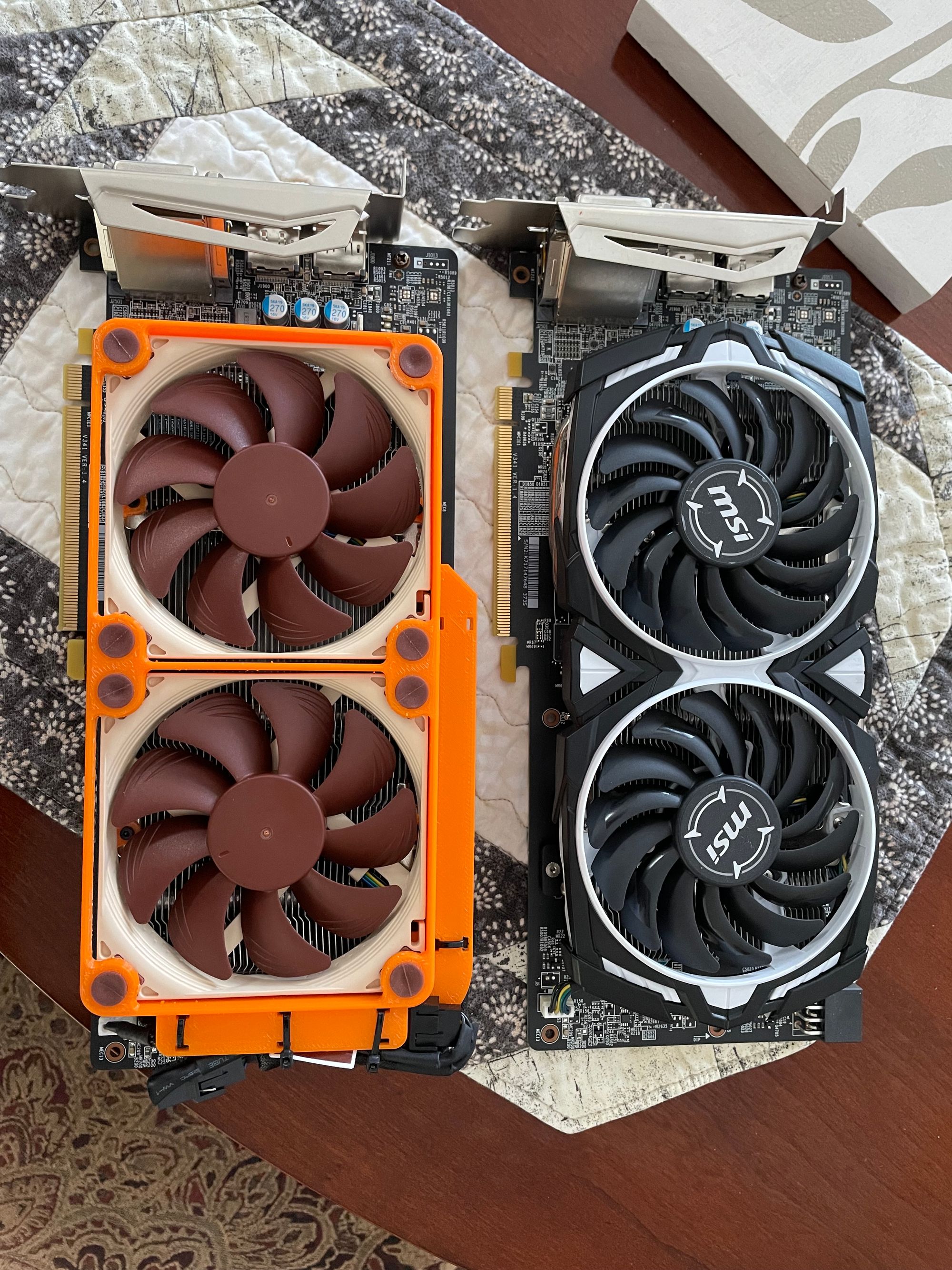 A popular make of fan both in use in PCs and 3D printers is the Noctua which comes in a variety of sizes. Their popularity springs from their much quieter operating sound levels so people often change the stock fans out for Noctua. Take a look at this design as an example of a 3D printed attachment which allows replacement Noctua fans to be added to the MSI RX580 Armor GPU.
