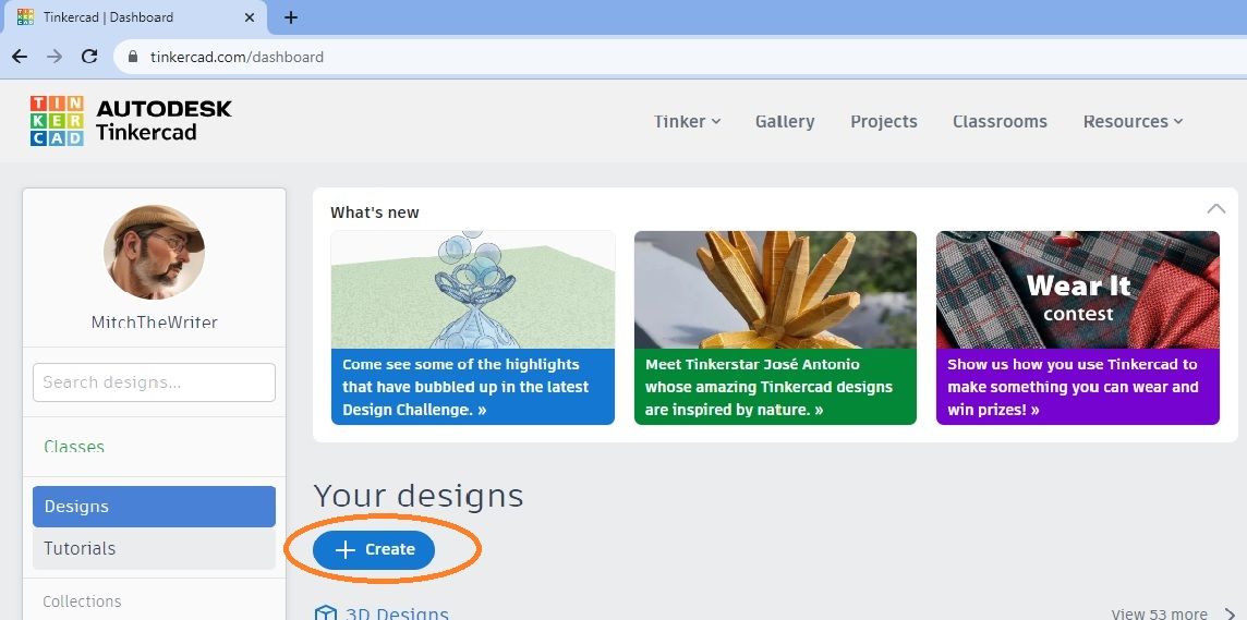 Firstly, go to the “dashboard” where you’ll see your profile picture if you’ve added one and in the middle of the screen a button that says “+create” which I’ve put an orange ring around on Image 1 below. Click on this, choose “3D Design” from the dropdown and you’ll be taken to the main design area of Tinkercad as shown in Image 2 below.