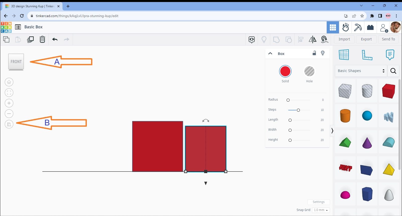 Now we need to move box 2 so that its in position where we want the void to be in box 1. At the moment, the screen is in a 3D mode and showing the front elevation. It’s easier to see where you’re moving objects to if you change the view to the left side in the first instance. You can do this by clicking on the image of the box on the top left hand side of the screen (arrow A) and simply click on the highlighted side you want to see. Then click on the other image of a box at the bottom of the left hand menu to change the perspective (arrow B). Have a look at Image 10 and this should now be your view (apart from my arrows of course).
