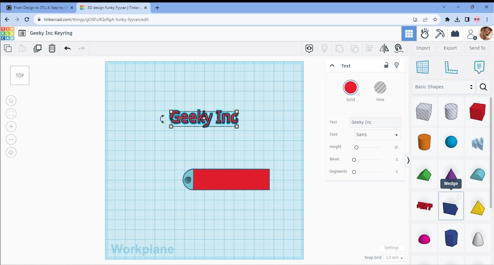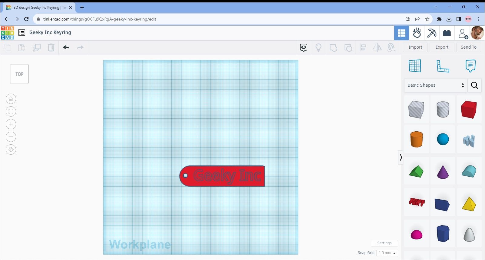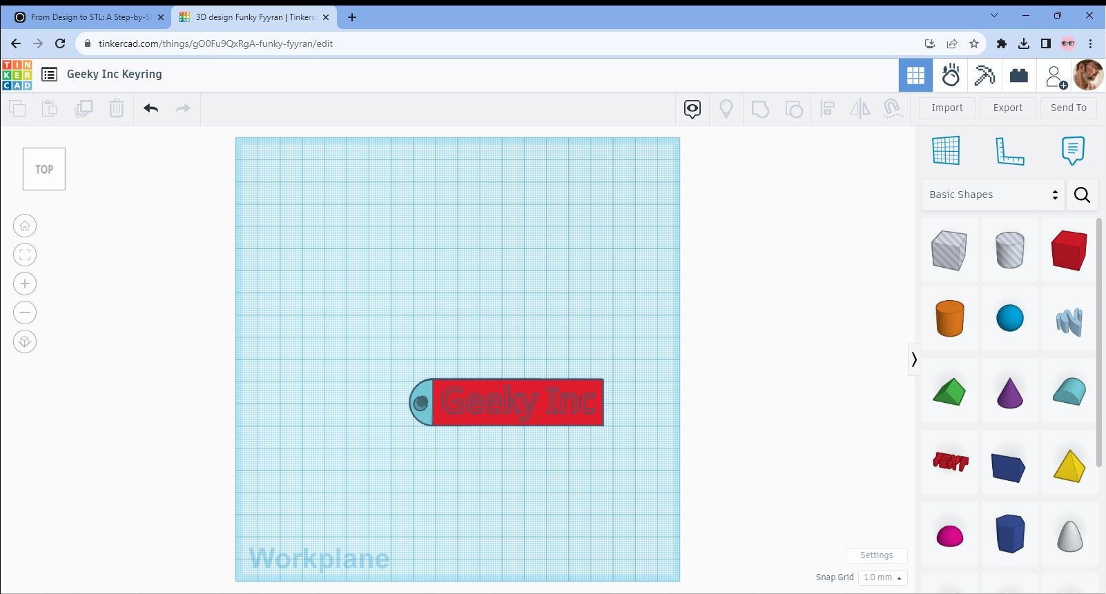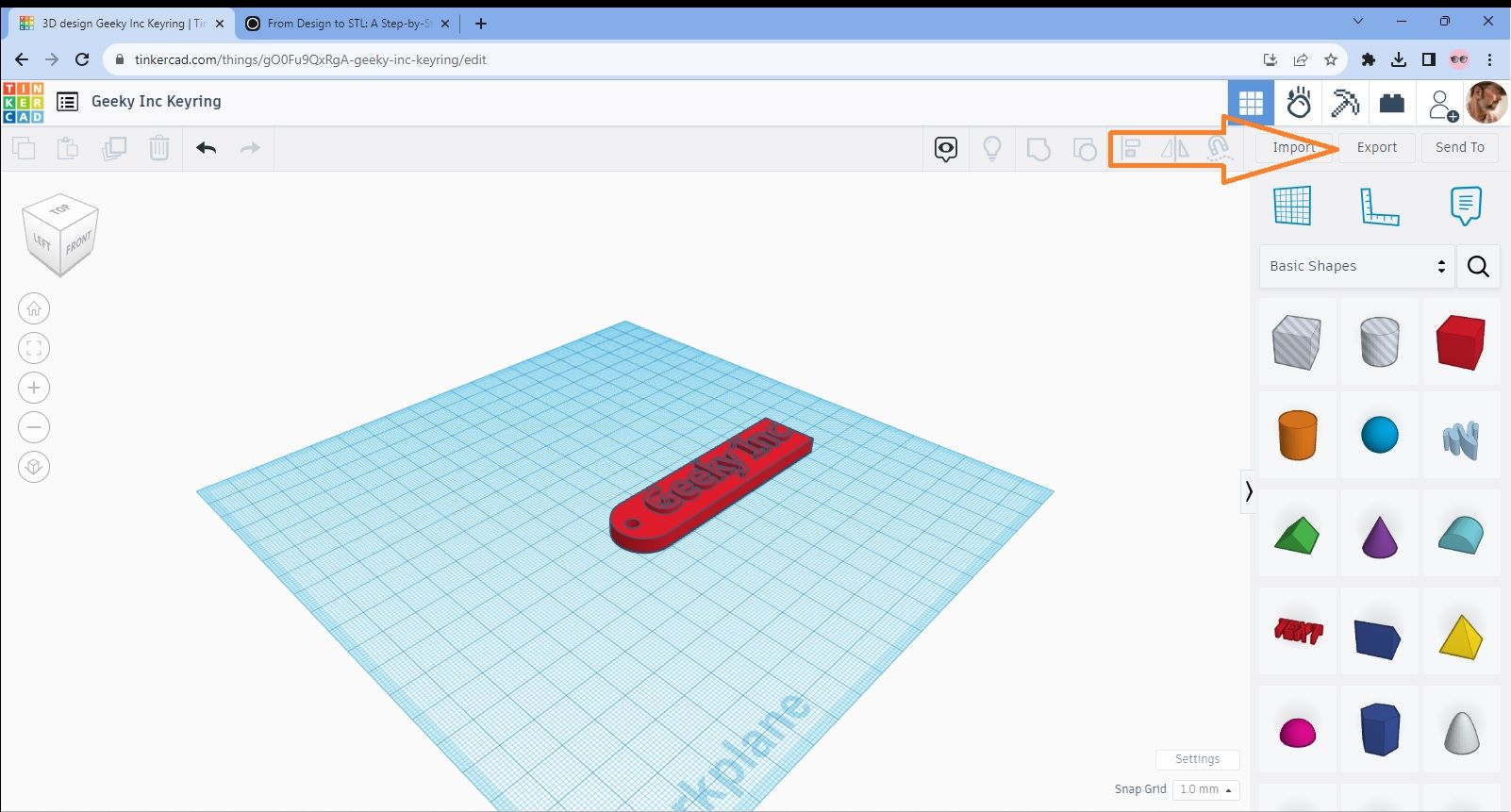 We’ll work with the Geey Inc Keyring design as it was the last one we did and the process is really simple from this stage. Tinkercad automatically saves your work so there’s no concerns about losing the design. The process of converting and saving it as an STL is what we’re ultimately aiming for though and it’s really straightforward.